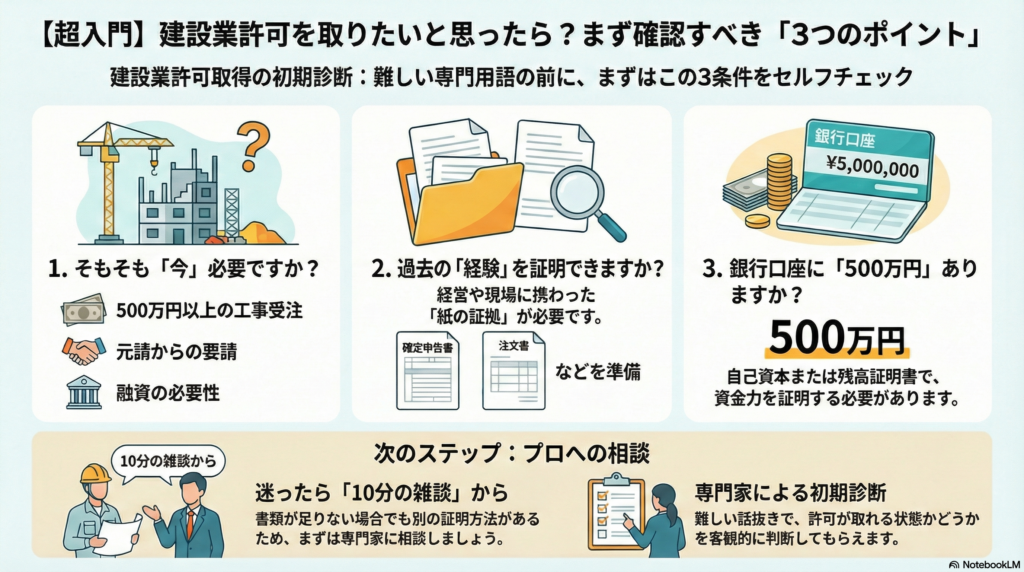 【超入門】建設業許可を取りたいと思ったら、まず最初に確認すべき「3つのこと」