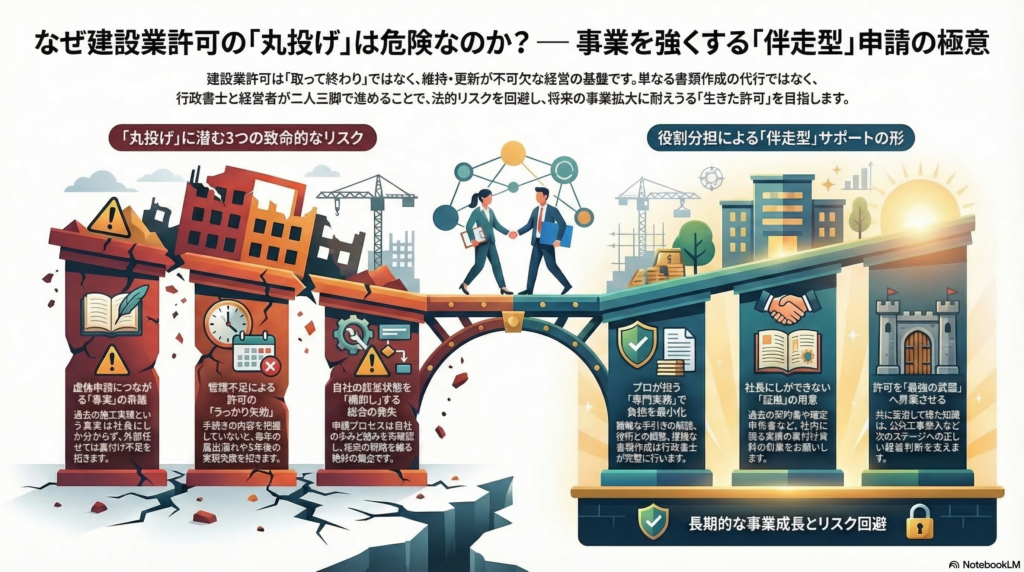 私たち行政書士は、書類を作成し、法的な論点を整理するプロです。しかし、「過去にどんな工事を、誰と、どうやって施工してきたか」という事実をゼロから生み出すことは絶対にできません。 ここを外部に丸投げしようとすると、十分な裏付けがないまま「とりあえず通ればいい」という強引な申請になりかねず、最悪の場合は建設業法違反(虚偽申請)という致命的な事態に繋がる恐れがあります。