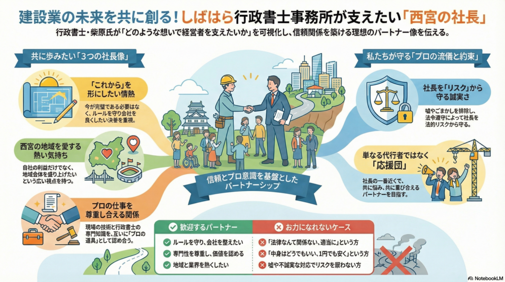 西宮で建設業を営む皆さま、こんにちは。「西宮の建設業を、日本で一番熱い業界に。」しばはら行政書士事務所の柴原重太です。